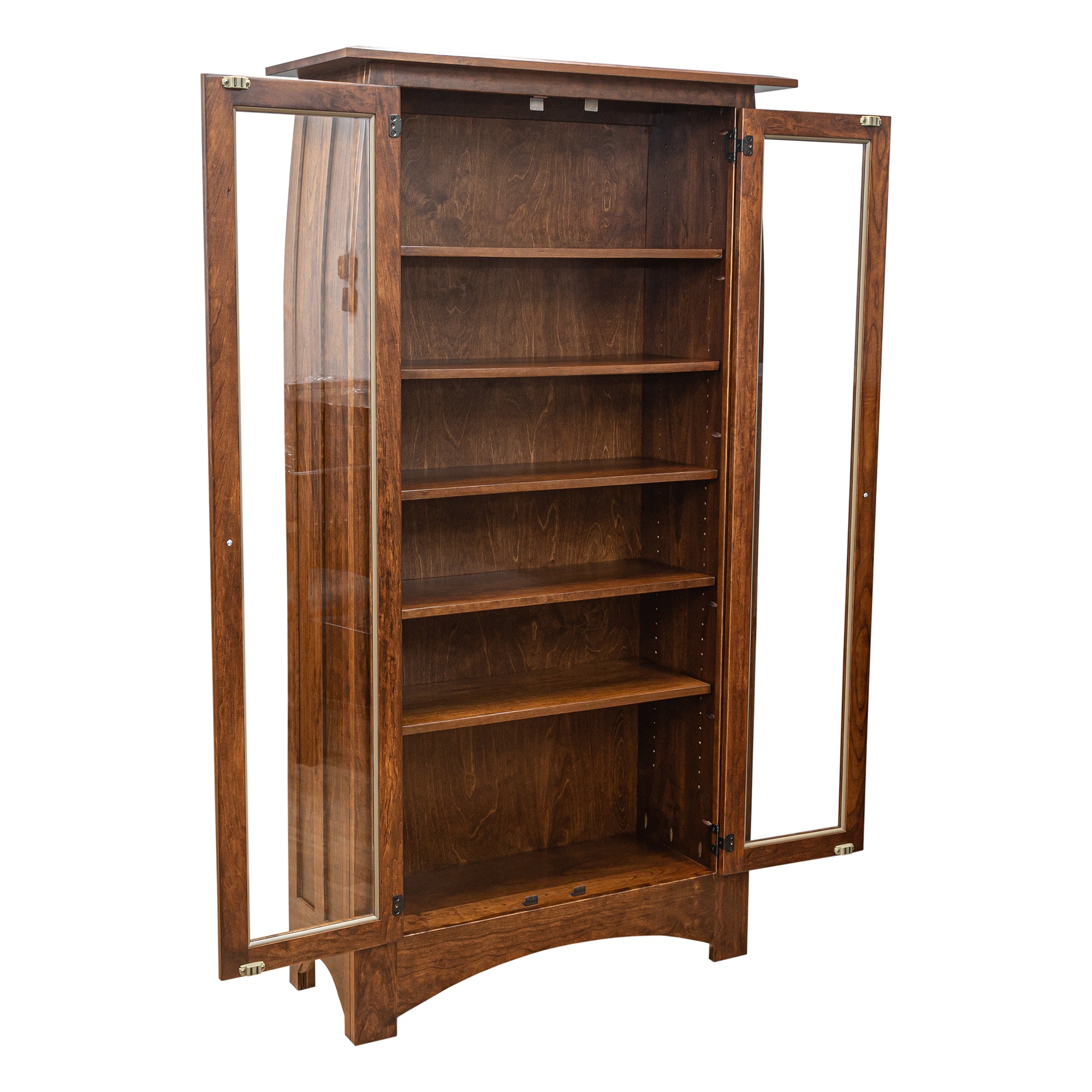 This curvaceous Bookcase is part of our Aspen Series. It is shown in Character Cherry wood in the OCS 113 stain.