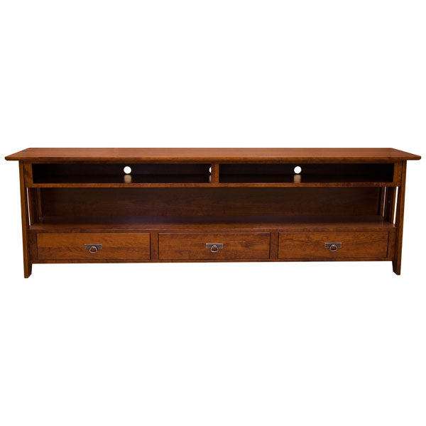 This 102? Amish Mission Tempe TV Stand is perfect for sustaining wide screen plasma TVs. This unit is constructed from Solid Oak and finished in a Mission finish (shown) which is protected by a conversion varnish that guards against stains caused by water, oil, alcohol and even nail polish. In addition, this unit is skillfully constructed by highly experienced Amish craftsmen in the Heartland of America following high standards to ensure this piece is of heirloom-quality. Furthermore, the bottom drawers are built from solid oak and are bonded with dovetail joints. These drawers also glide on full-extension side-mount soft-close drawer glides that operate smoothly. These features give this TV Stand not only a distinguished look but an elegant and prestigious feel as well.