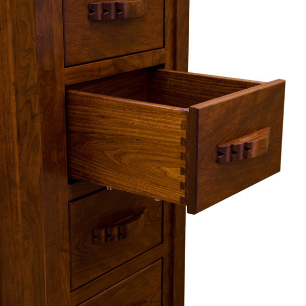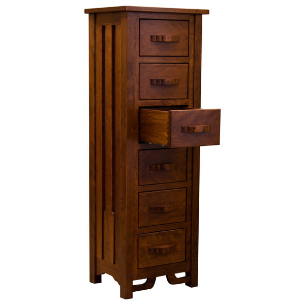 The detailed woodwork of this classic piece is typical of that seen in the Gamble House of Pasadena, California. This archetypal and timeless Lingerie is a hallmark to the contributions of the Arts & Crafts movement. This 6-Drawer Lingerie features English dovetail drawers that sit on full-extension ball bearings that easily and effortlessly glide open and shut. In addition, this elegant and durable piece is sealed with a conversion varnish that protects this piece from water, oil, alcohol and even nail polish. Furthermore, every surface of this Lingerie is softly smoothed and rounded to the touch without the sharp corners and edges.