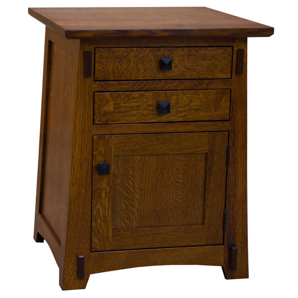 This 22" Amish Mission Two-Drawer/One Door End Table boasts an unparalleled level of craftsmanship in handmade furniture; constructed by highly experienced Amish craftsmen using solid Plain Cut Oak. This exceptionally durable end table is also sealed with conversion varnish that protects this elegant piece from water, oil, alcohol and even nail polish. Furthermore, it features plenty of space with two drawer and one door cabinet. These features give this end table not only a refined look but a prestigious feel as well.