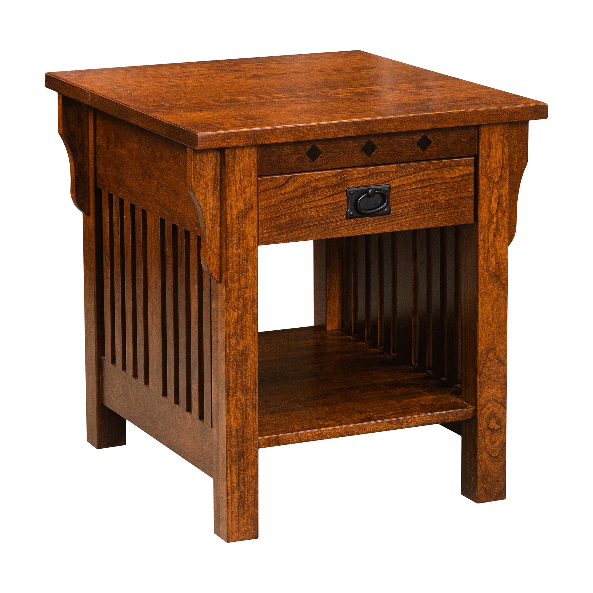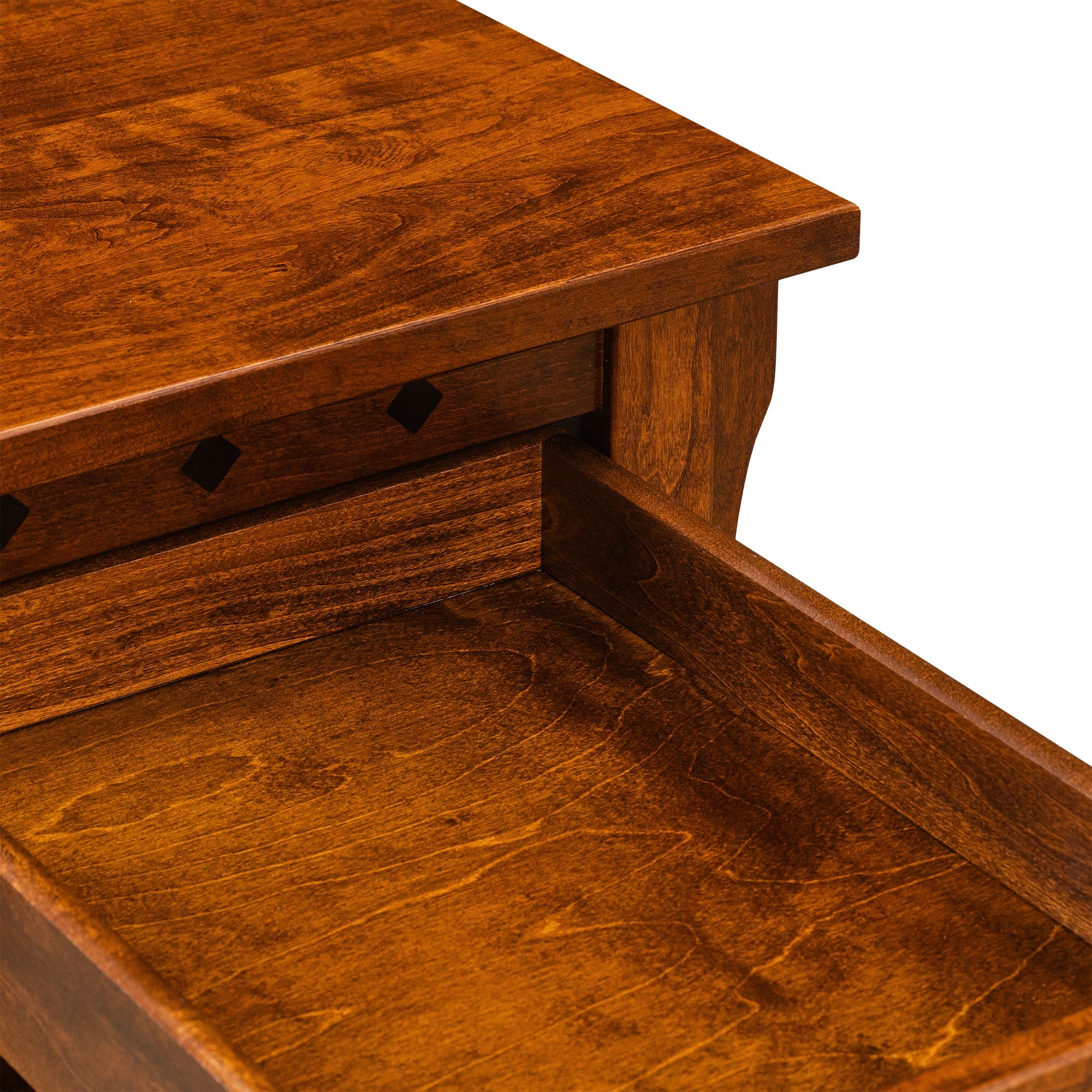 This solid wood end table features classic mission-style slats, a smooth pull-out drawer, and a lower shelf for added storage. Its warm finish and handcrafted details make it the perfect mission end table for living rooms, bedrooms, or cozy reading spaces.