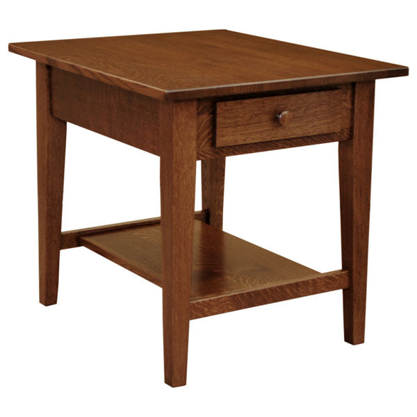 This 22" x 26" Amish Mission Shaker End Table w/ Drawer boasts an unparalleled level of craftsmanship in handmade furniture. Skillfully constructed by highly experienced Amish craftsmen using solid Quarter Sawn White Oak (shown), you can take pride in owning furniture built to the highest standards with the strictest attention to detail.