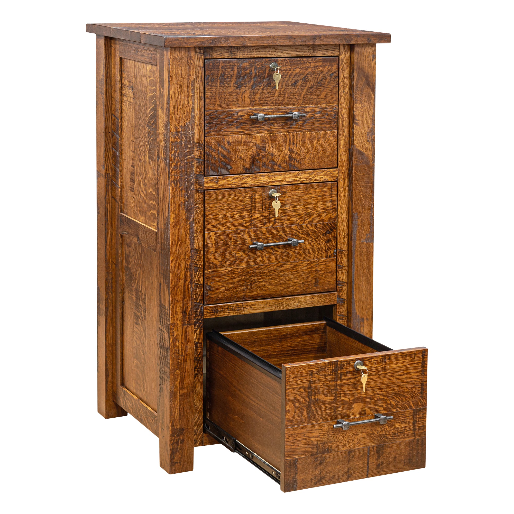 The 24" Settlers Three-Drawer File Cabinet is the perfect piece to keep your work organized and to add the elegance of handmade solid quarter-sawn oak to your executive office or home office.