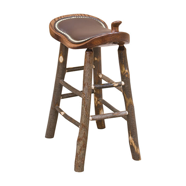 This Western saddle bar stool is shown in 30" high and is also available in 18" Chair height and 24" counter height. The seat is Solid Oak and hand bent. The saddle shown has genuine cowhide leather seat with nail head trim. Your choice is as shown in Hickory with the bark still on the spindles or regular legs. It's made in America which is the best for durability and keeps jobs right here in the USA. It is suitable for commercial and residential projects. Call for quantity discounts.