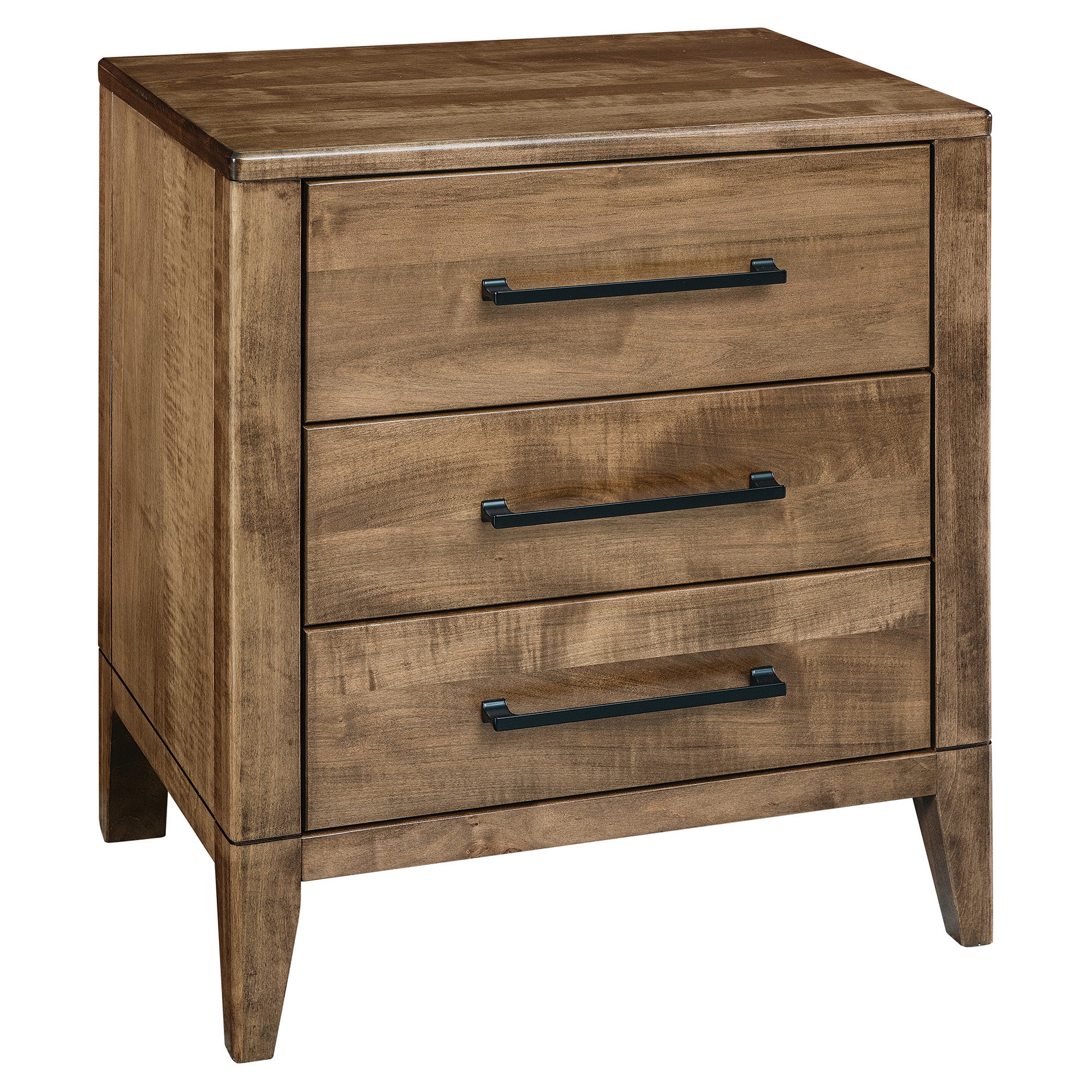 The beautiful, three-drawer night stand provides ample storage and sophistication with a two-tone wood design and traditional, clean lines, making this a wonderful addition to any bedroom. This Amish-crafted night stand features three drawers with clean, dark pulls, ideal for storage of extra clothing, books, and more. This handsome, American-made night stand is one of many pieces of bedroom furniture from Barn Furniture Mart, which includes beds, dressers, chests, and more. Measuring 24 1/2" wide by 20 3/4" deep by 28 1/4" high, this rustic night stand is available in an array of finishes and wood options to suit your needs, including cherry, oak, maple, and hickory (pictured in cherry). Like all of our solid wood furniture, this lovely three-drawer night stand is made in the USA, is designed to be water and stain resistant, and comes with a satisfaction guarantee.