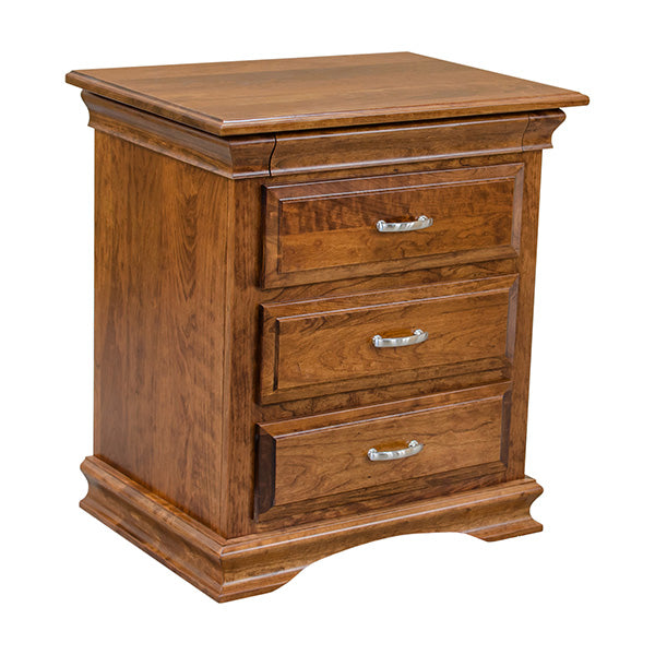 This Traditional Summit nighstand is crafted in Solid Black Cherry Wood harvested from carefully monitored woodlands. Drawers are English Dovetailed front and back and drawer boxes are finely finished with an OCS-113 stain, however alternate colors are also available, from very Light to Ebony Black. All matching pieces are available! Various wood options and different hardware options are also available.