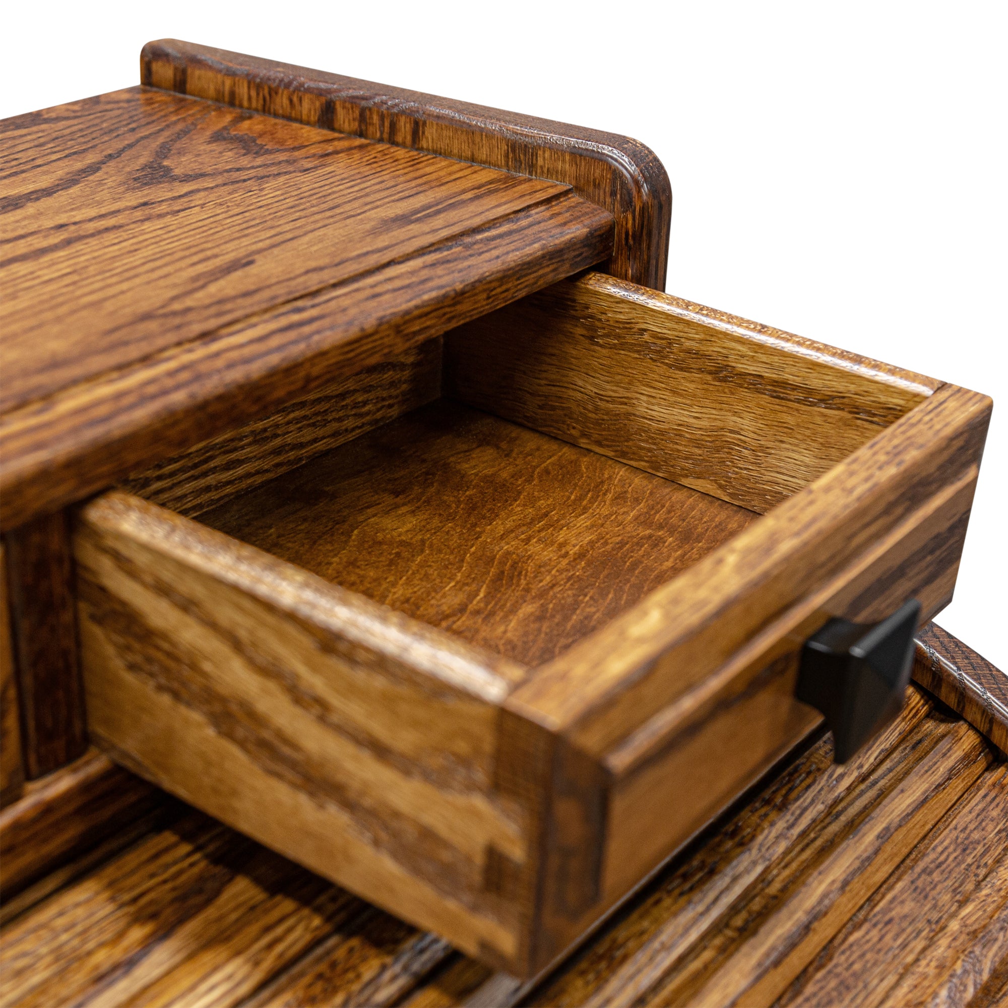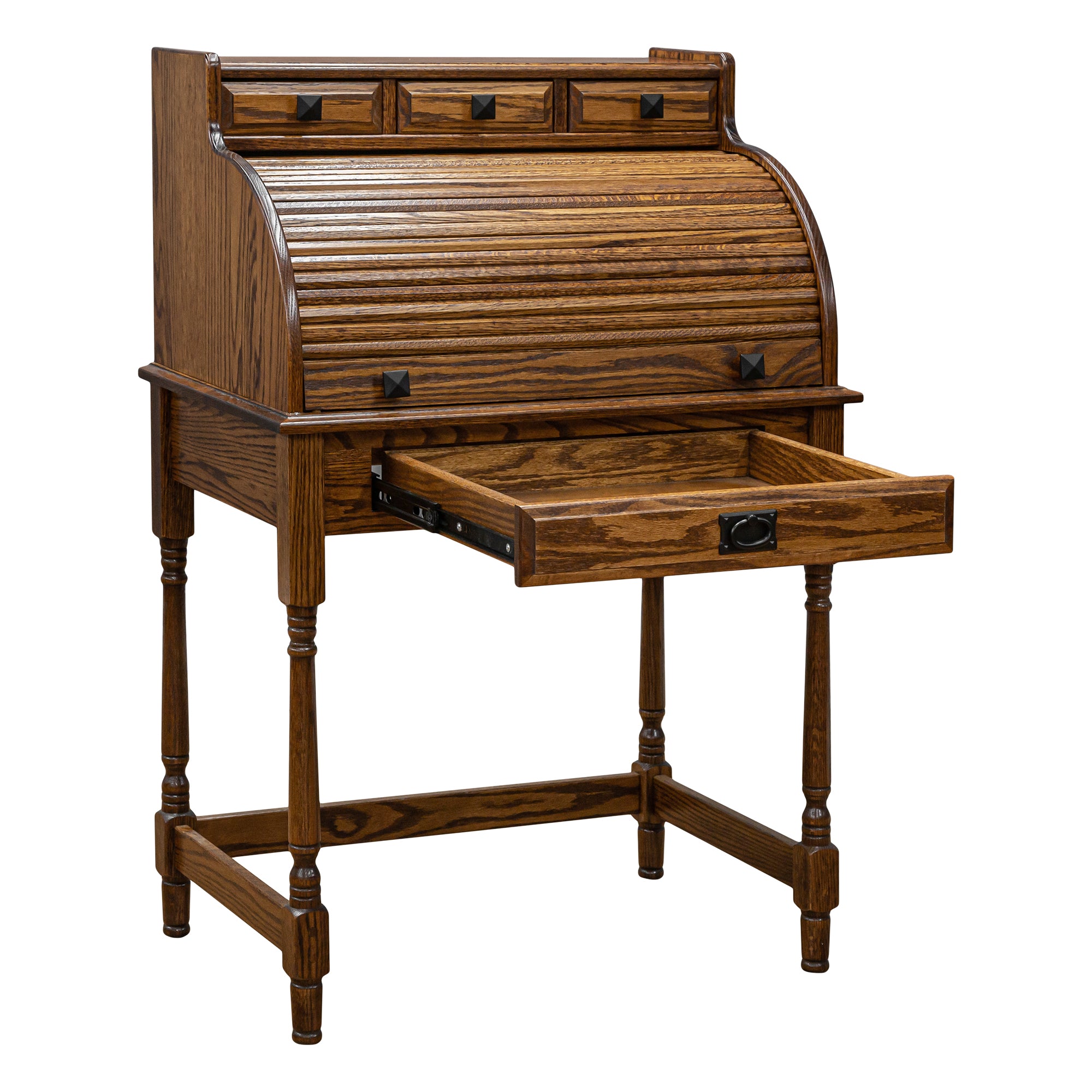 This 30" Amish Standard Roll-Top Desk w a finish back is proudly made in the United States by highly experienced Amish Craftsmen. It is constructed using solid Plain Cut Oak(shown). This Amish handmade Roll-Top Desk boasts an unparalleled level of craftsmanship and you can take pride in owning furniture that's built to the highest standards and with the strictest attention to detail.