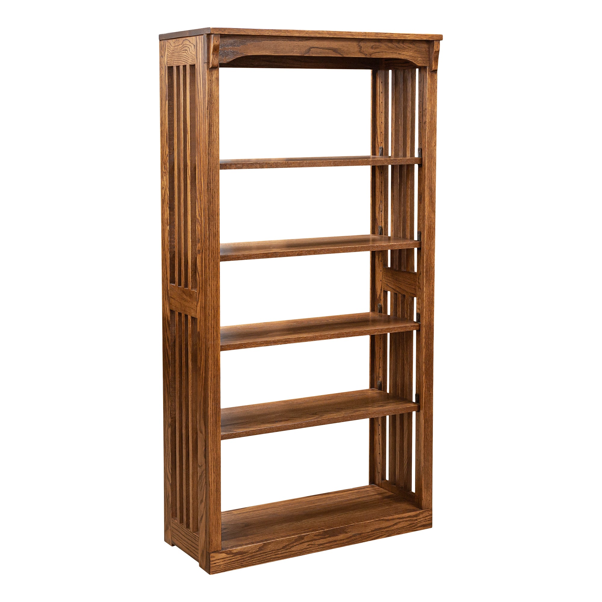 Utilitarian yet aesthetic, this solid oak 30" x 60", mission spindle bookcase is nostalgic of the Arts and Crafts movement. In perfect Arts and Crafts fashion of distinctive functionality and undeniable durability, flush sides allow this piece to sit completely adjacent to another wall unit.