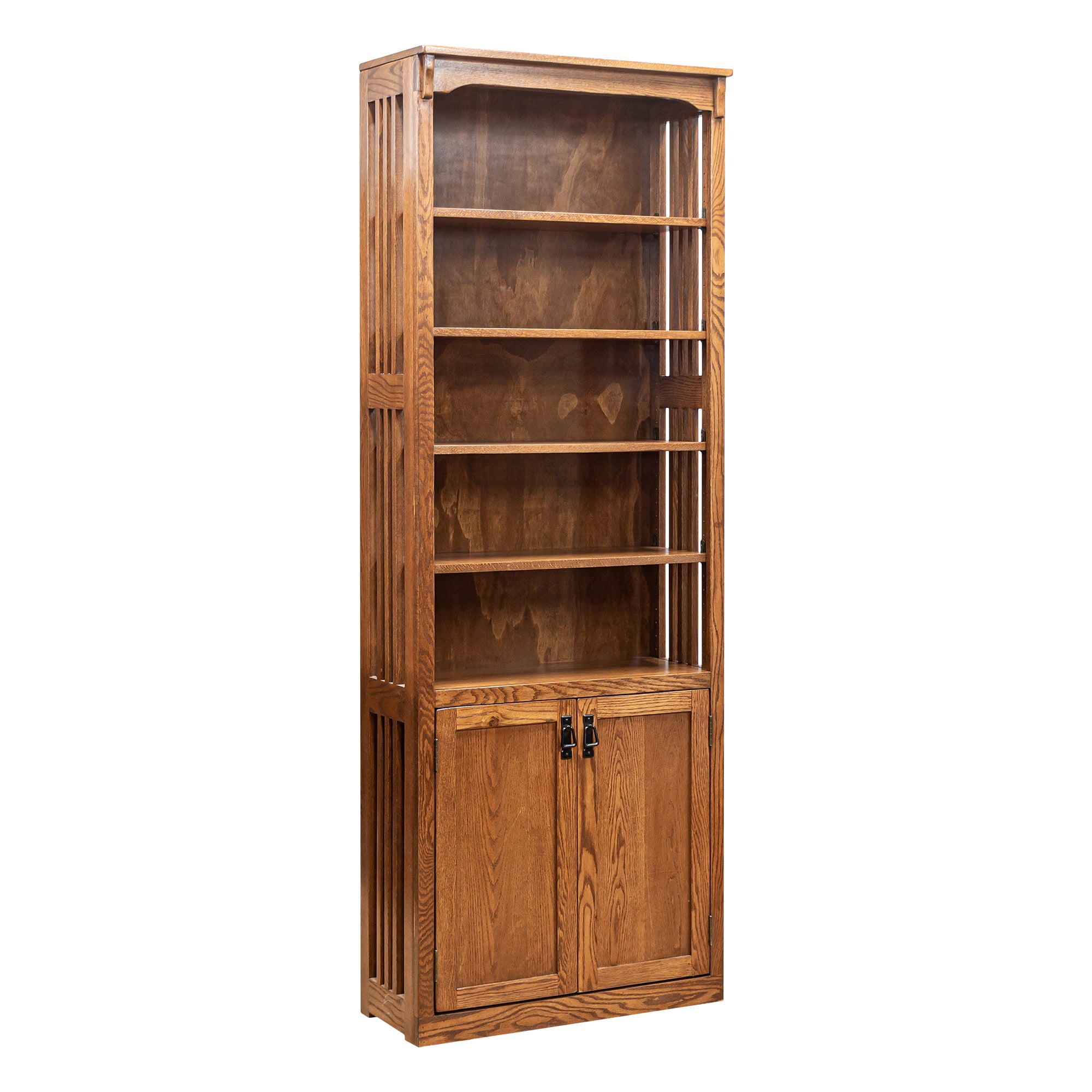 This 30" x 84" Solid Oak Mission Spindle Bookcase with Bottom Doors is proudly made in the United States by exceptional craftsmanship and remarkable quality. The design of this unit creates a simple, yet elegant look. Hand made using sturdy solid oak, and NO particle board. This exceptionally durable bookcase features two bottom cabinets with one adjustable shelf inside and four adjustable shelves to place books or any home decor. Furthermore, this bookcase also features a hand-applied stain and plenty of storage space. With a huge variety of sizes and matching pieces, such as mission file cabinets, desk, sofas and much more; this Mission Spindle Bookcase will be a great addition to your home or office.