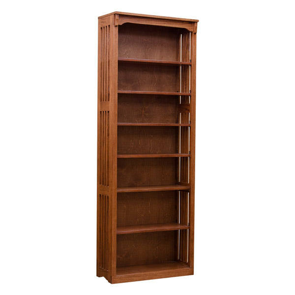 Utilitarian yet aesthetic, this solid oak 30? x 84?, 6 shelf, mission spindle bookcase is nostalgic of the Arts and Crafts movement. In perfect Arts and Crafts fashion of distinctive functionality and undeniable durability, flush sides allow this piece to sit completely adjacent to another wall unit.