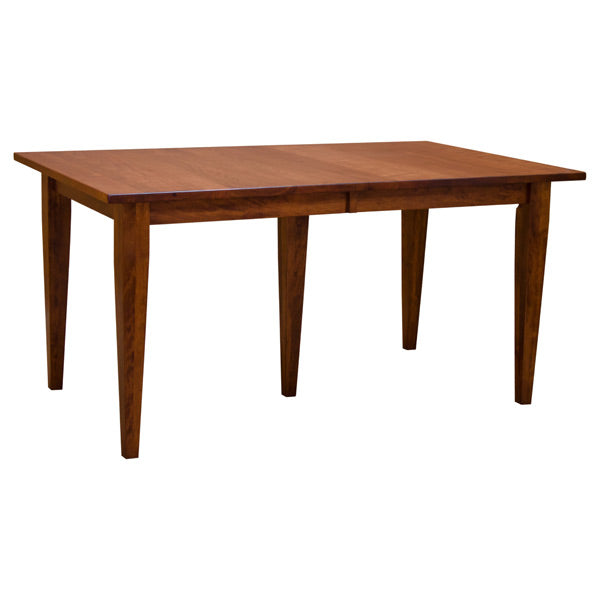 This Amish Harvest Shaker Dining Table with Leaves boasts an unparalleled level of craftsmanship in handmade furniture. Constructed by skilled Amish craftsmen using solid cherry wood and finished in a warm Mission Cherry Finish (shown). The overall style of this particular table is reminiscent of the classic Shaker design emphasizing elegance through simplicity. With its width, it can only self-store two leaves without an apron. This elegant solid harvest table can sit up to maximum of ten people. And accommodate six people comfortably when in its regular size without leaves.