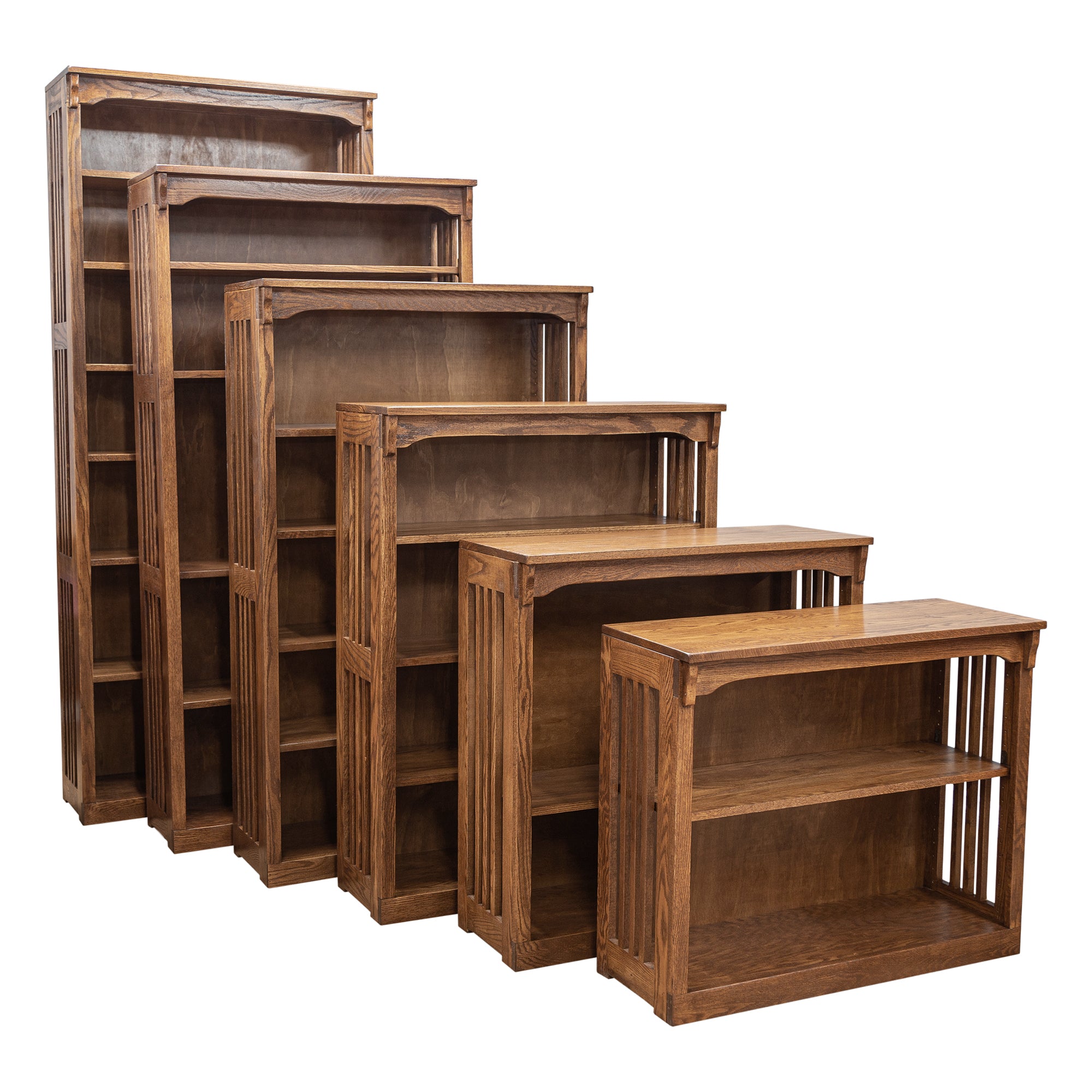 Utilitarian yet aesthetic, this solid oak 36? x 60?, 5 shelf, mission spindle bookcase is nostalgic of the Arts and Crafts movement. In perfect Arts and Crafts fashion of distinctive functionality and undeniable durability, flush sides allow this piece to sit completely adjacent to another wall unit.