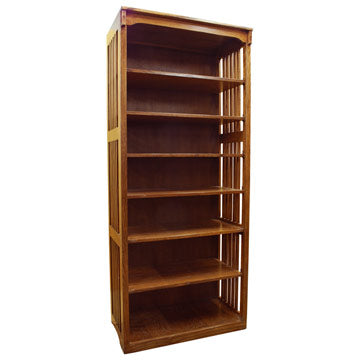 This 36" x 84" x 18" Solid Oak Mission Spindle Bookcase is proudly made in the United States by exceptional craftsmanship and remarkable quality. The design of this furniture creates a simple, yet elegant look. Hand made using sturdy solid oak, and NO particle board. You can take pride in owning furniture built to the highest standards of quality. This Bookcase features a mission cherry satin lacquered bar top finish and it is also available in twenty different sizes. Furthermore, this bookcase is made to match other popular, stylish items such as mission file cabinets, desks, sofas, Morris chairs, coffee tables, end tables, sofa tables, and rocking chairs.