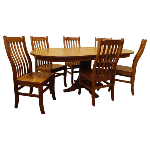 This 42" Round Mission Table Set w/ Three Leaves is perfect for small and large gatherings. This table remains true to the Arts & Crafts style and it is built in the Heartland of America by highly experienced Amish Craftsman from solid Quarter Sawn Oak (shown). The simplicity and quality of this table is unrivaled with it solid oak construction and its beautiful grain patterns that are highly visible.