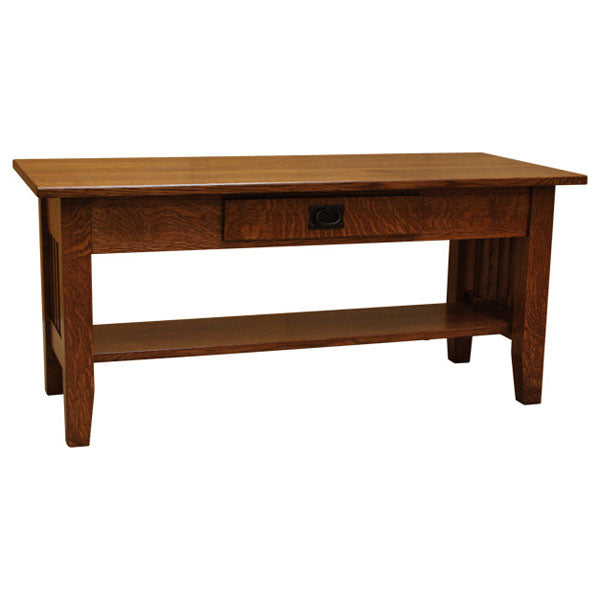 Demonstrated in a simple yet elegant design this 42? x 19? Amish Mission Prairie Coffee Table w/ Drawer has stood the test of time. This Coffee Table is skillfully constructed in the United States by the Amish Craftsmen using Solid Quarter Sawn White Oak (shown).