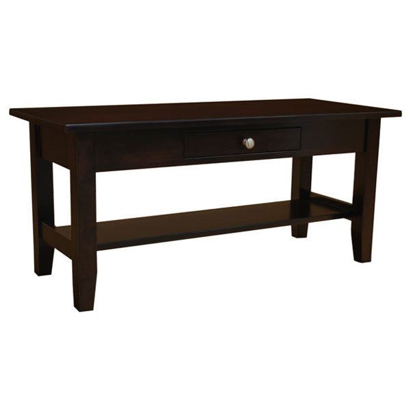 This 42" x 19" Amish One Drawer Coffee Table displays an elegance and simplicity that has stood the test of time. This Amish Coffee Table is built with hand selected solid Brown Maple and finished in a Onyx Finish(shown). You can take pride in owning furniture that is built to the highest standards and with the strictest attention to detail.