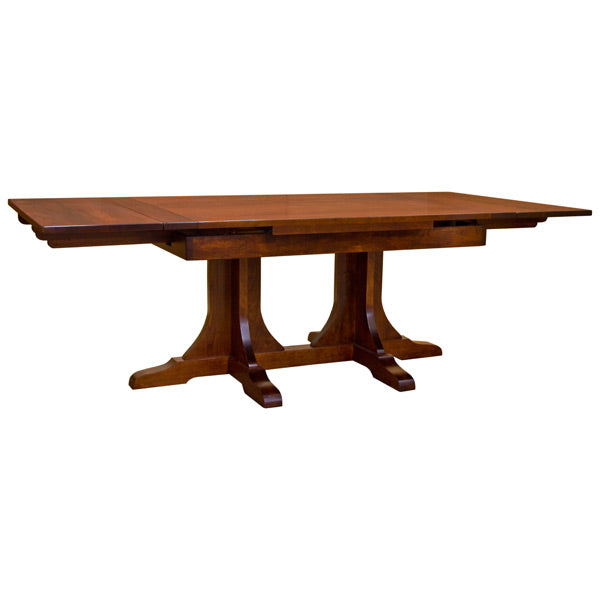 A Draw leaf tables were developed in England back in the 16th century. We added with a twist of the classic Arts & Crafts movement style. This solid cherry table can be extended by pulling out one of the leaves under the table top. With its strongly built mission double pedestal base and an easily slide out sturdy leaves, it?s a conversational piece that will be admired in your dining room.