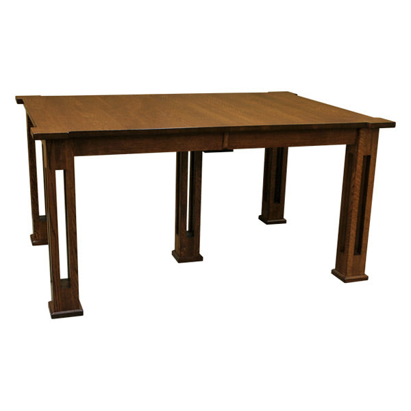 This 42"x60" Amish Mission Parker Table w/ 4-Leaves boasts an unparalleled level of craftsmanship in handmade furniture. The style of this table features Parker legs built using tall pieces of solid wood stacked up like columns with hollow spaces between them. This construction method gives this table a lighter feeling, while still retaining the durability and sturdiness of the piece. Constructed by skilled Amish craftsmen using solid Quarter Sawn White Oak.