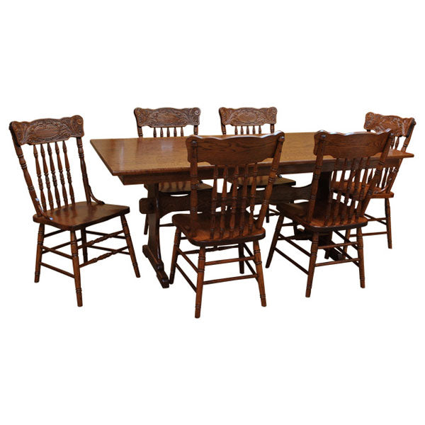 This 42" x 72? Amish Trestle Dining Table Set-6 is built according to the traditional woodworking standards of the Arts & Crafts period, and it exemplifies the standards of heirloom quality furniture. This dining set is Handmade in the United States by highly experienced Amish Craftsman and it is constructed from solid Quarter Sawn White Oak (shown).