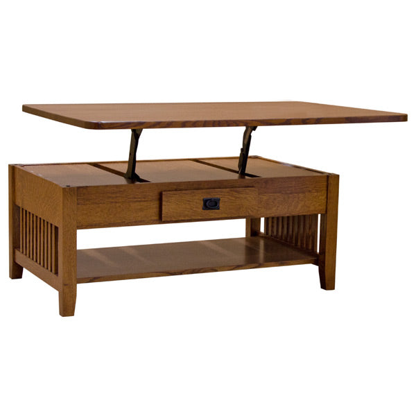 Demonstrated in a simple yet elegant design this 48? Amish Prairie Lift Top Coffee Table w/ drawer has stood the test of time. This Coffee Table is skillfully constructed in the United States by the Amish Craftsmen with Solid Quarter Sawn White Oak (shown). You can take pride in owning furniture built to the highest standards with the strictest attention to detail.