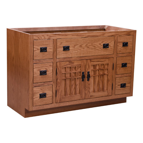 This gorgeous Mission Sink Vanity is a custom built piece. We can build one for you in any size or design. See pull down at left for approximate pricing. As shown, it is made out of Solid Red Oak wood in the OCS 113 stain.