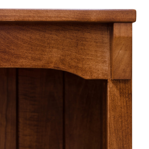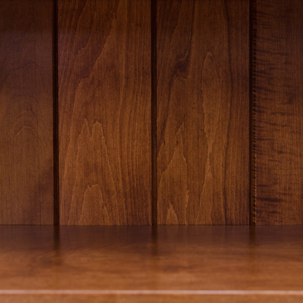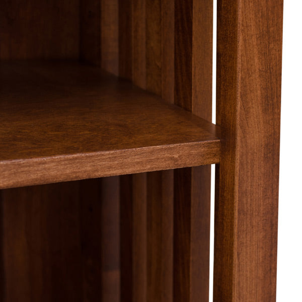 It has four solid wood shelves are adjustable. This exquisite bookcase has a shiplap back that is ? inch ?floating? recessed panels that allow the fully finished cherry wood to naturally contract and expand with the weather. And lastly, it is proudly made in US and does not contain any particle board or veneer.
