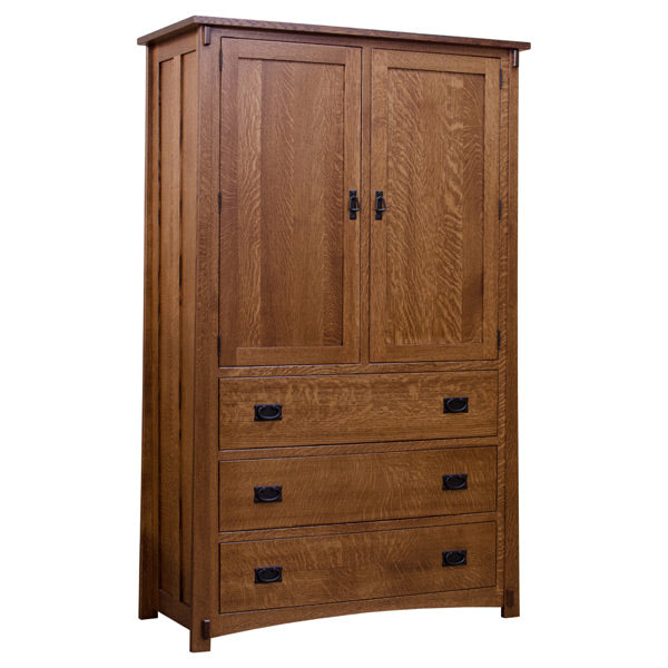 This 48" x 78" Amish Mission 3-Drawer Armoire displays a simple elegance and design that has stood the test of time. Constructed by skilled Amish craftsmen with Solid Quarter Sawn White Oak(shown), you can take pride in owning furniture built to the highest standards with the strictest attention to detail and unparalleled craftsmanship.