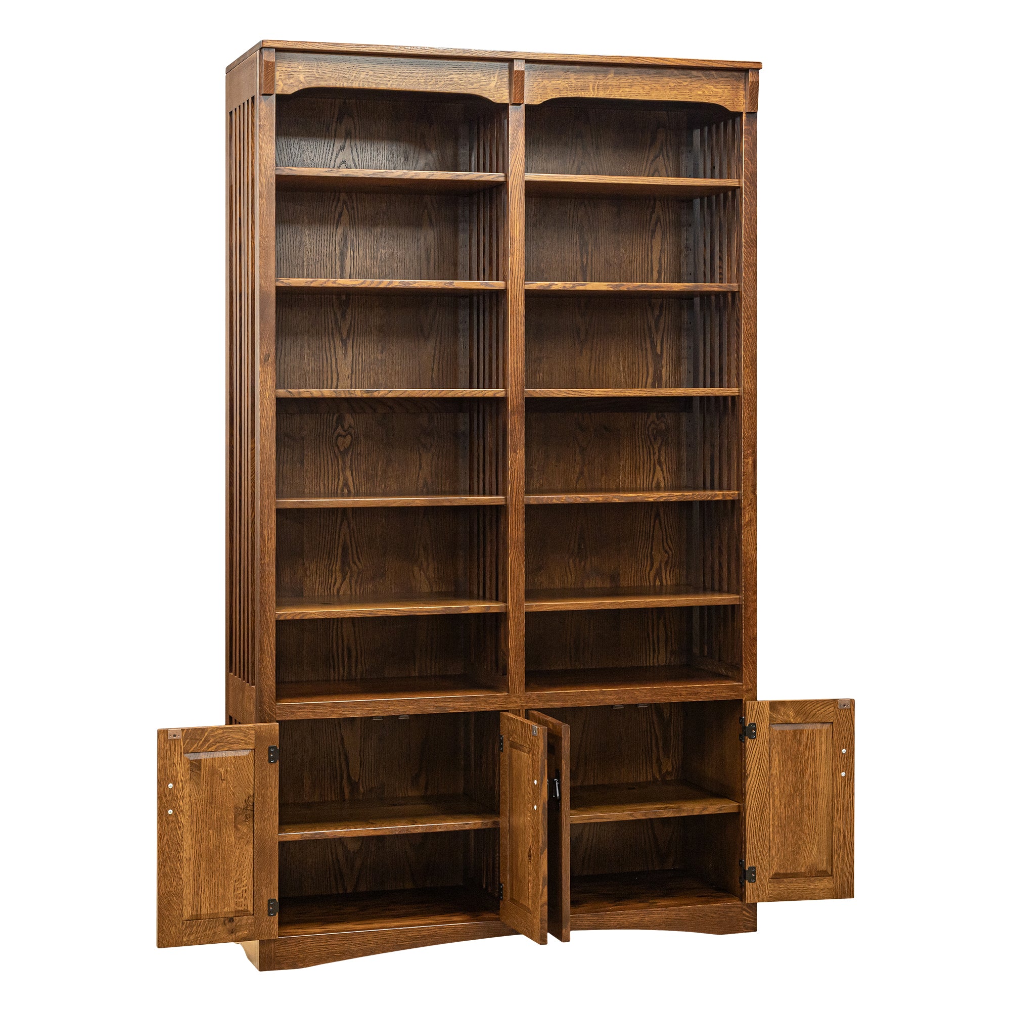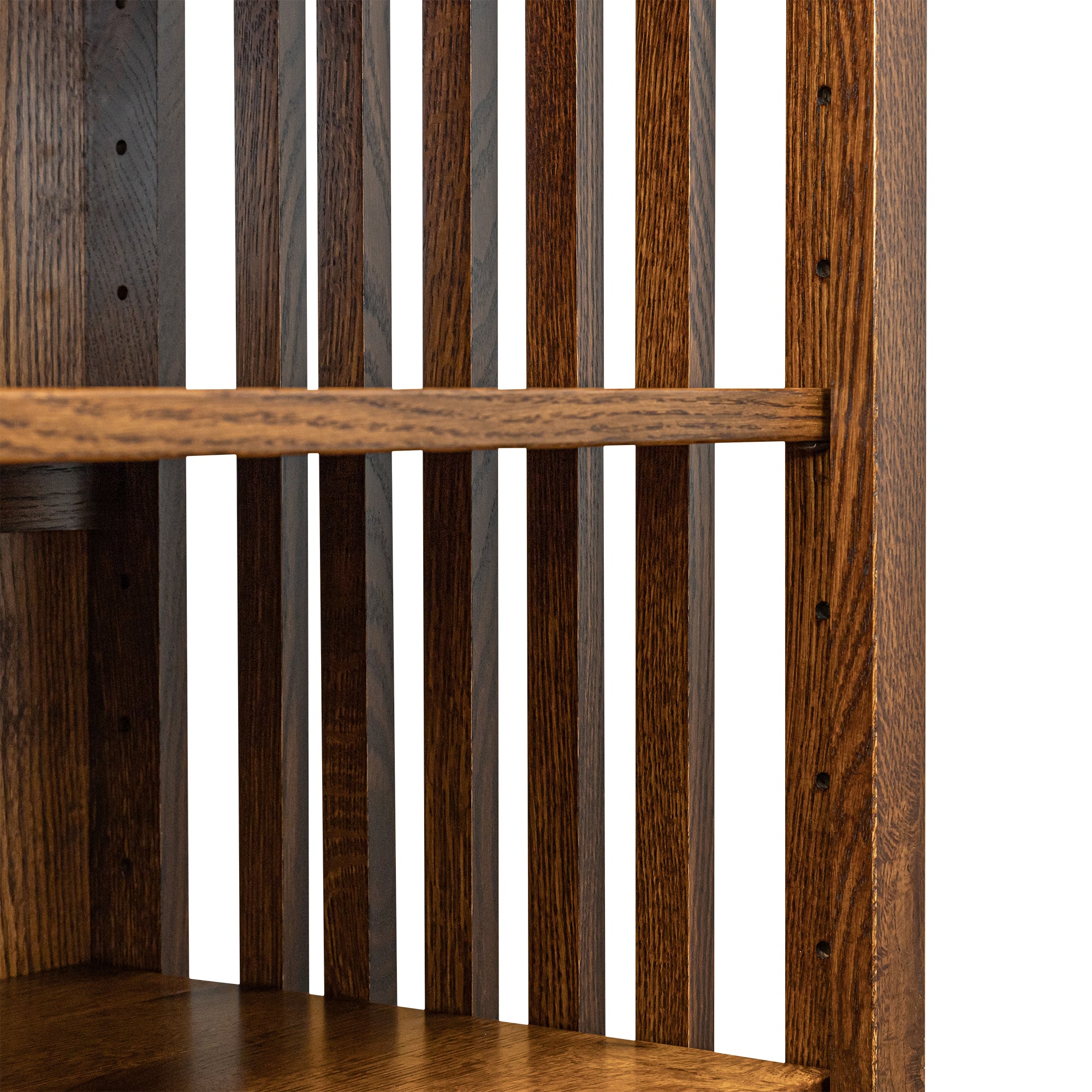 Utilitarian yet aesthetic, this solid oak 48" x 84", 18 shelf, mission spindle bookcase is nostalgic of the Arts and Crafts movement. In perfect Arts and Crafts fashion of distinctive functionality and undeniable durability, flush sides allow this piece to sit completely adjacent to another wall unit.