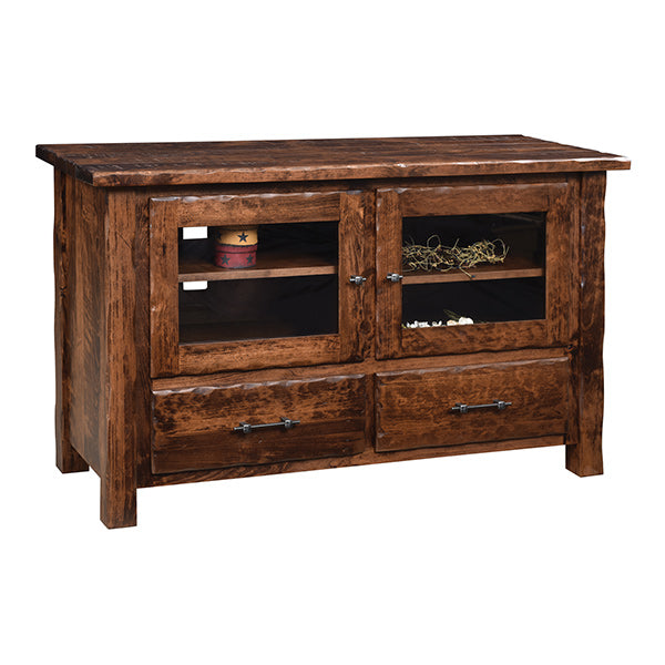 Bring some rustic style to your living room, den, or family room with the 50" Hand Hewn TV Stand, part of a series of hand-hewn, custom-made furniture from Barn Furniture. This amazing television stand offers beautiful chisel marks and distressed details throughout, and has a lovely glass-inset cabinet for display of items, as well as a pair of drawers for storing movies or other media. Measuring 30" high by 50" wide by 18" deep, this elegant television stand would be a great companion to the Hand Hewn Coffee Table or Sofa Table. The American-made TV stand comes in a range of woods and finishes to suit any color scheme, such as brown maple, red oak, rustic cherry (as pictured), and more! Like all of our solid wood furniture, this Reclaimed hand-hewn television stand is designed to be water and stain resistant, and is made in the USA.