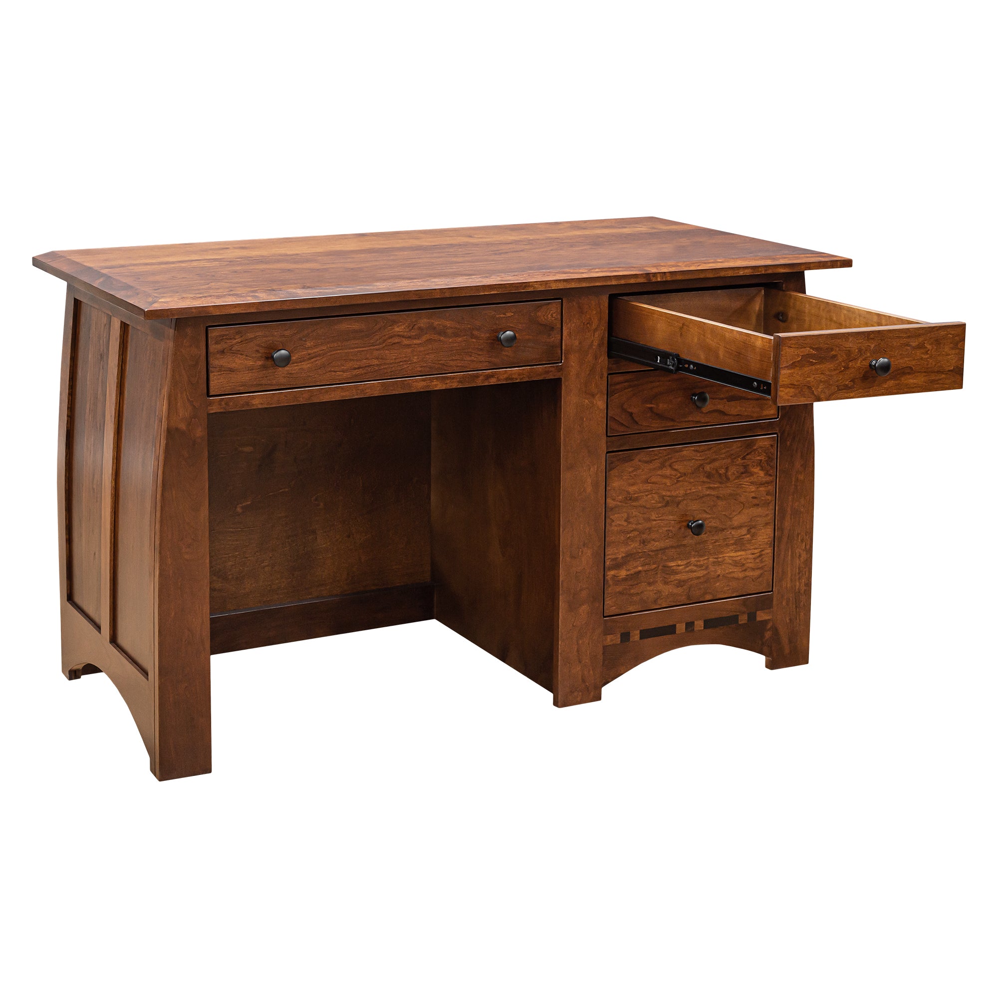 This Amish Hand Made Aspen Writing Desk pictured here is 52" wide and also available in any size and any special details requested. Priced here in Solid Character Cherry wood however, All woods are available in your choice of Plain Cut Oak, Quarter Sawn White Oak, Walnut, Cherry, or Elm. Color choices are almost unlimited (see below). Call for Quotation for changes. This unique design harkens back to the mid 20th Century but will be at home in any Architectural era where wood and simple curves catch the eye. We can build any piece of furniture in this design.