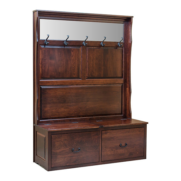 This unique Hall Tree proudly made in the United States. This well built storage bench has two individual compartments plus easy access full extension drawers with dovetail joints. Moreover, this can be used to store shoes, boots and other items for making it a well kept area. And the five sturdy hooks can be used to hang your coats, jacket and hats.