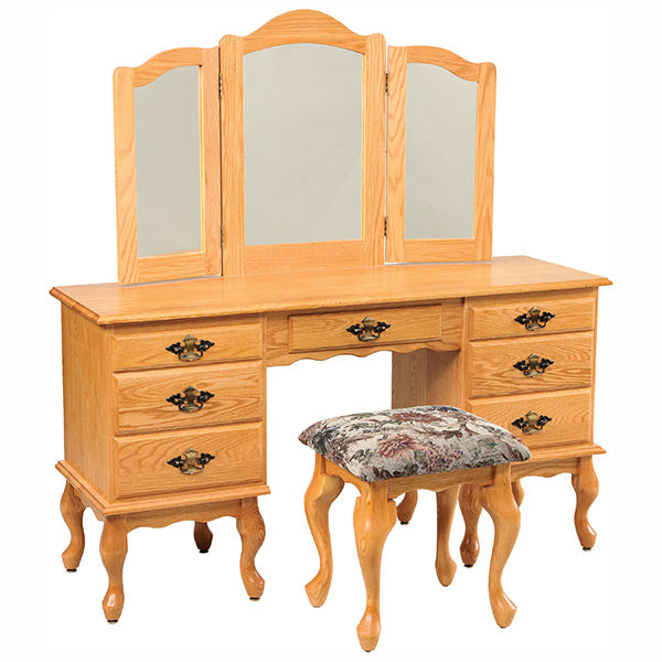 This Amish Hand Made Make up Vanity is shown in Solid Oak and is also available in your choice Solid Character Cherry or Quarter Sawn White Oak. Color Choices are almost unlimited. This piece is no cheap Veneer Import; this is a hand crafted solid American hardwood vanity. Mirror included, check pull down for options. Bench option