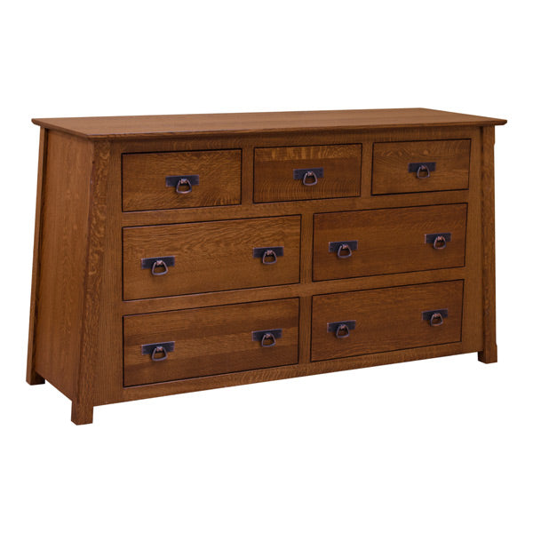 This 60" Amish Mission 7-Drawer Dresser is constructed from Solid Quarter Sawn White Oak and finished in a Mission Finish (shown); this unit features solid oak drawers made with traditional English dovetail joints. In addition, the drawers sit on full-extension under-mount soft-close drawer guides that easily glide open and shut with no exertion necessary.