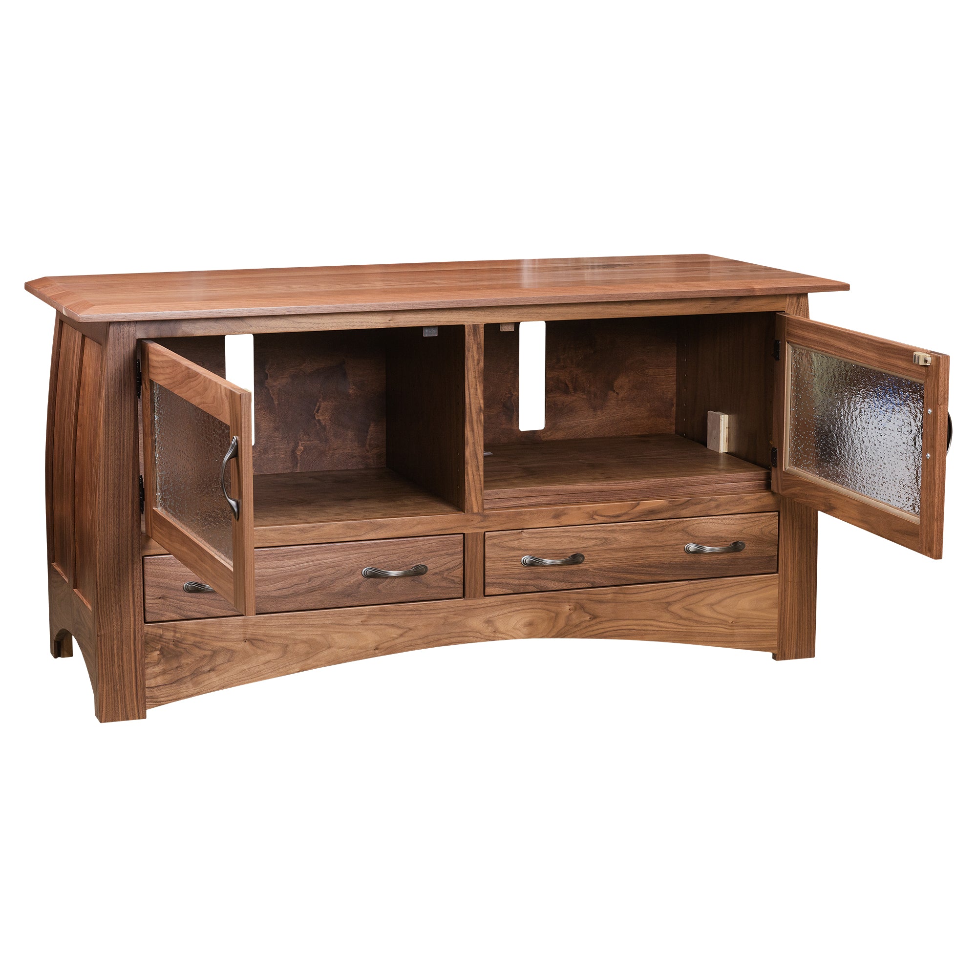 Elevate your space with this Solid walnut TV stand, featuring textured glass doors, four storage drawers, and a sleek curved design. Perfect for organizing electronics while adding a warm, handcrafted touch to your living room. Ideal walnut media console for modern or rustic homes.