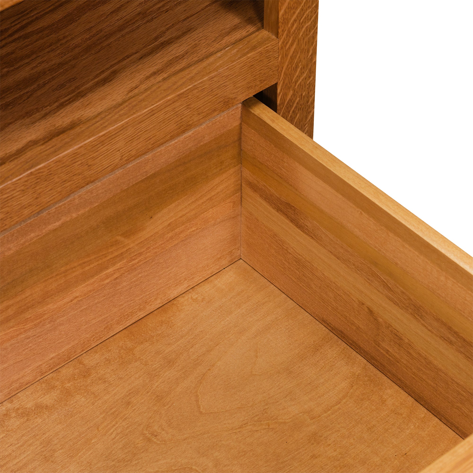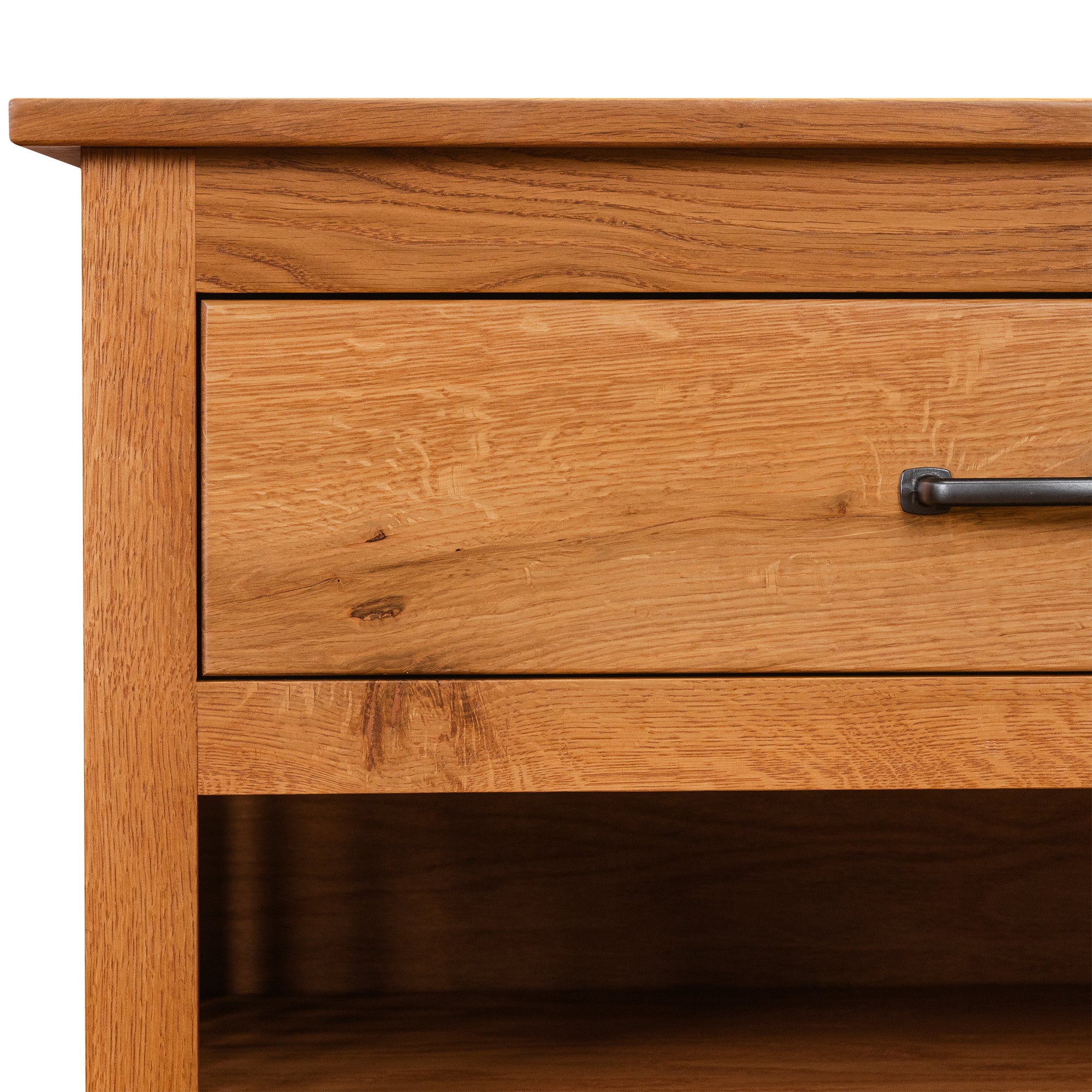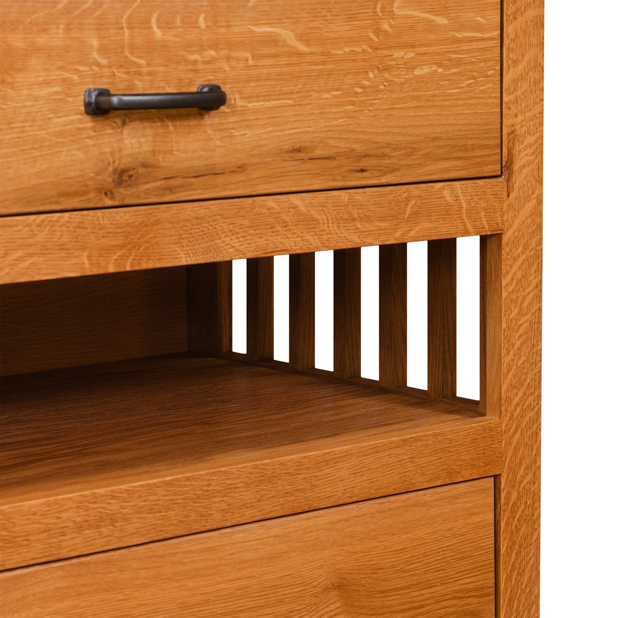 The clean Mission lines, classic slatted side details, and rich natural finish make this piece ideal for living rooms, entertainment spaces, or family rooms. The open shelves are perfect for media components or décor, while the smooth-gliding drawers keep cables, remotes, and accessories neatly tucked away.