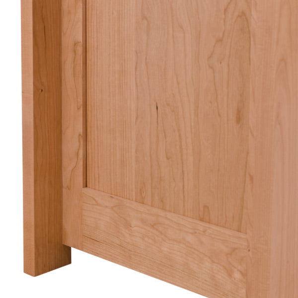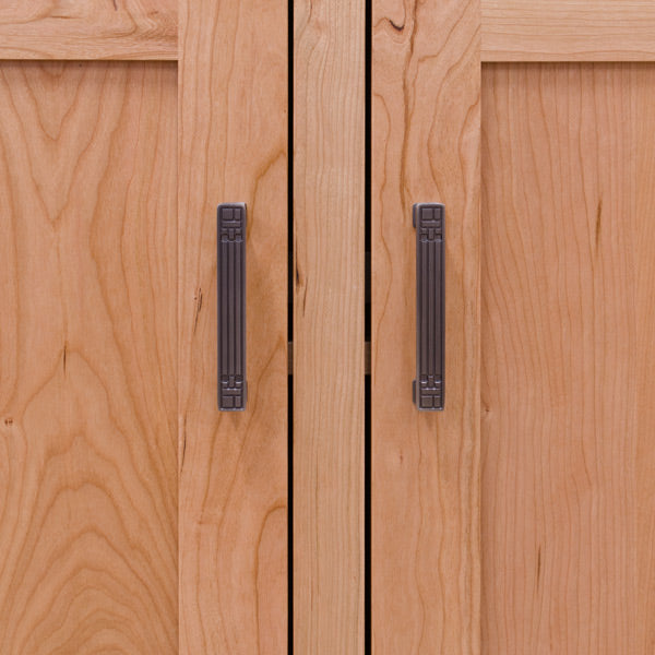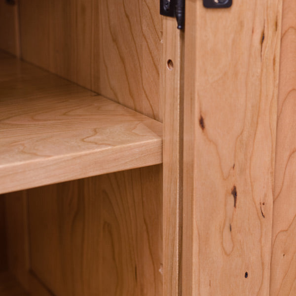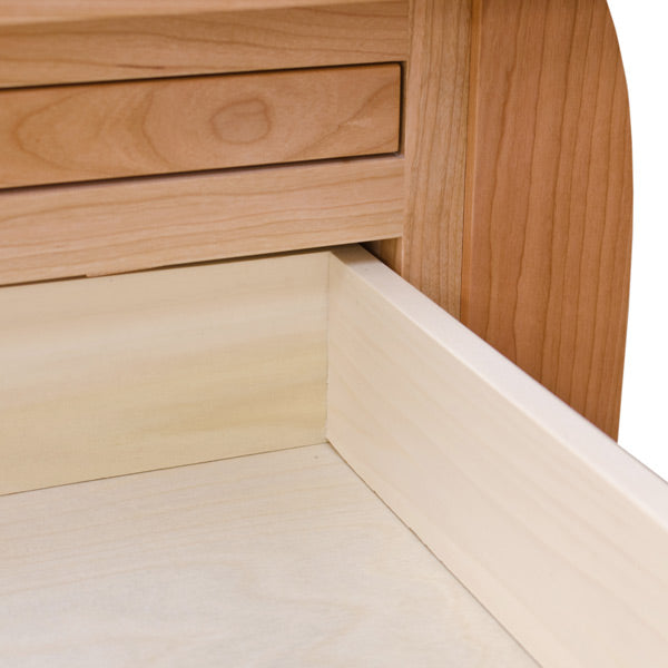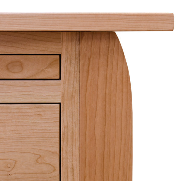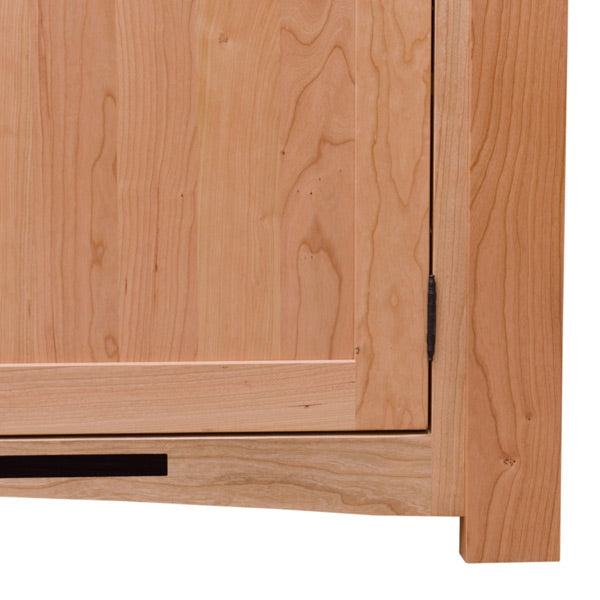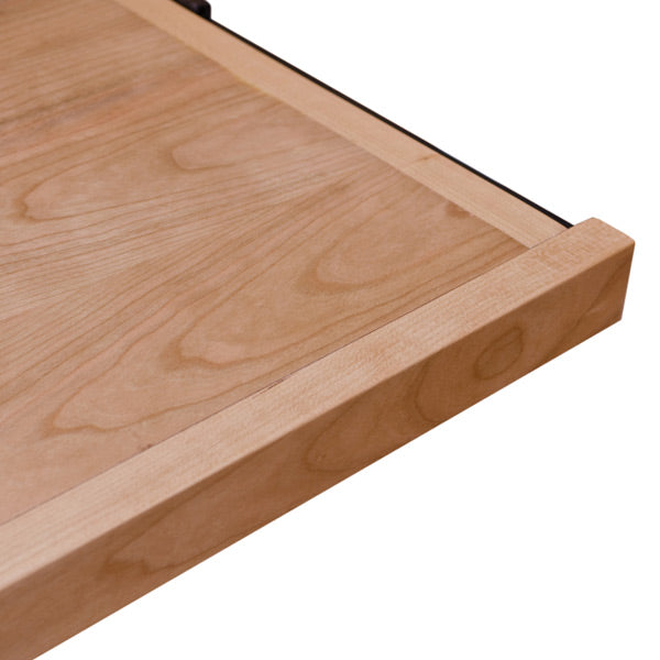 This magnificent Vail Boat Server is gorgeous piece that is aesthetically appealing with a unique curve side shape and ebony inlays on the top and bottom. This has a two bread board pull out if extra serving space is needed. As shown, this is Cherry wood that is finished in the natural finish. One of the characteristic of the Cherry wood is that when finished in the lighter stain such as a natural stain. It will naturally darken overtime especially when it is a close proximity to a window that gets a lot of sunlight. This comes in a variety of stains that you can pick in our OCS stain collection.