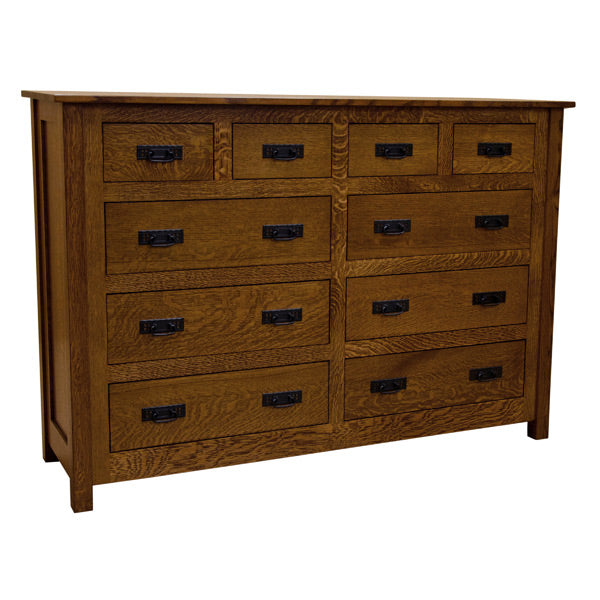 This Amish-constructed 10-Drawer Dresser is an elegant piece. Constructed from Solid Oak and finished in a warm Mission Cherry, this unit features solid oak drawers made with traditional English dovetail joints. The drawers sit on full-extension under-mount soft-close drawer guides that easily glide open and shut with no exertion necessary. The drawer guides are also ?easy-release and easy-set,? which allows them to come out of the unit with ease.