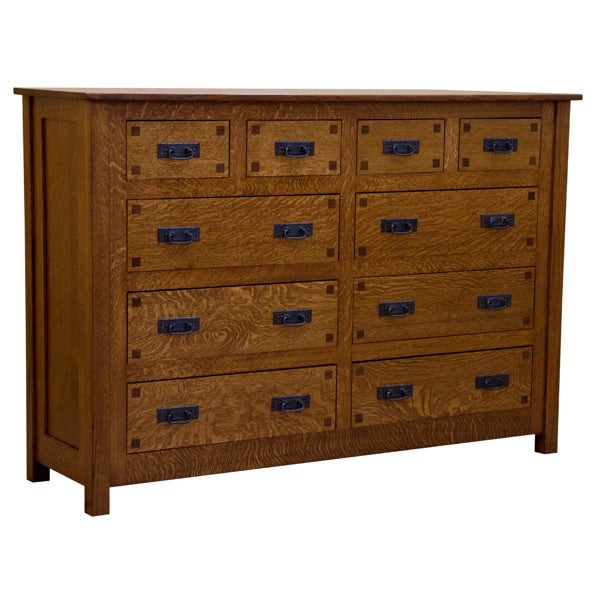 This 64" Amish Mission 10-Drawer Dresser w/ Inlays is an elegant piece. Constructed from Solid Oak and finished in a warm Mission Cherry, this unit features solid oak drawers made with traditional English dovetail joints. The drawers sit on full-extension under-mount soft-close drawer guides that easily glide open and shut with no exertion necessary. The drawer guides are also ?easy-release and easy-set,? which allows them to come out of the unit with ease.