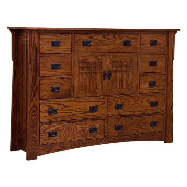 This 69" Amish Mission Bungalow Mule Dresser with Doors is an elegant piece worthy of being an heirloom for all of its exceptional qualities. Constructed from solid Plain Cut Oak and finished in a Mission Finish, this unit also features solid oak drawers made with traditional English dovetail joints. The drawers are on full-extension side-mount glides.