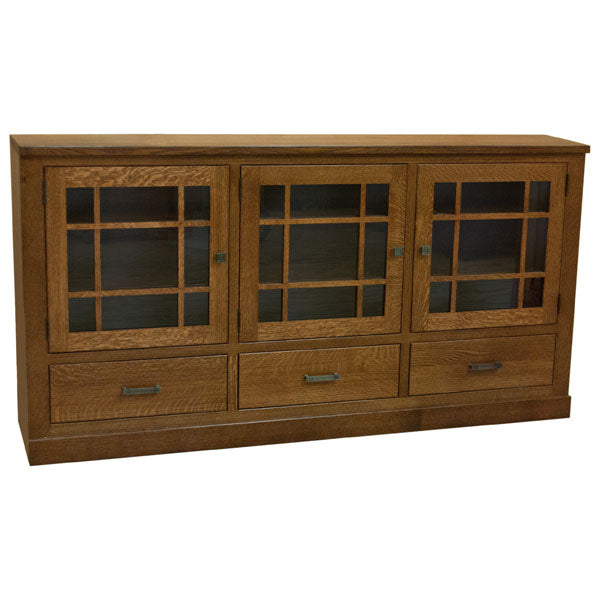 This 70" Amish Mission TV Stand is constructed skillfully in the United States by highly experienced Amish Craftsmen using Solid Oak. This TV Stand offers plenty of storage space. In addition, it features mullion glass doors over two compartments with adjustable shelves and three spacious drawers.