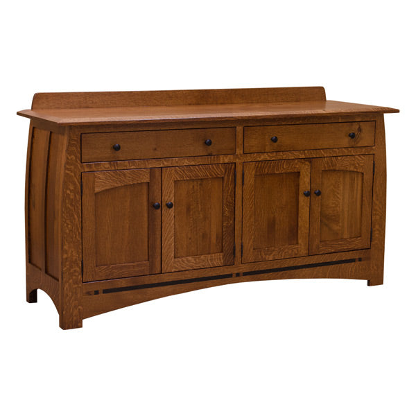 Admire the curvature pattern side and the beautiful ebony inlays that add artistic detail to this server. Lets talk a closer look what this unit offers. It has two solid wood drawers with full extension glides. A nice beveled smooth top. A spacious cabinet with a center divider and an adjustable shelf in each side. And lastly, the lovely backsplash to complete this look.