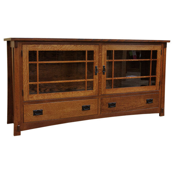 This 72" Amish Mission TV Stand is constructed skillfully in the United States by highly experienced Amish Craftsmen using Solid Oak. This TV Stand offers plenty of storage space. In addition, it features mullion glass doors over two compartments with adjustable shelves and three spacious drawers. This unit can also be made to have the three spacious drawers on the top.