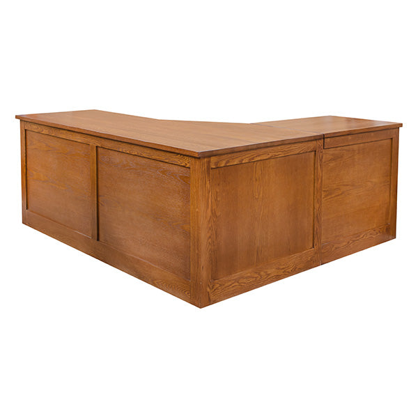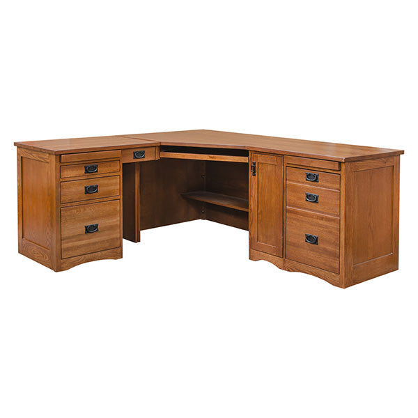 This 74? L-Shaped Mission Desk w/ Door is proudly made in the United States for exceptional craftsmanship and remarkable quality. The unique construction shown here features spindles reminiscent of the Arts and Crafts movement. This timeless style creates a simple, yet elegant look. Hand made using 1/4 Sawn Red Oak(shown), you can take pride in owning furniture built to the highest standards of quality.