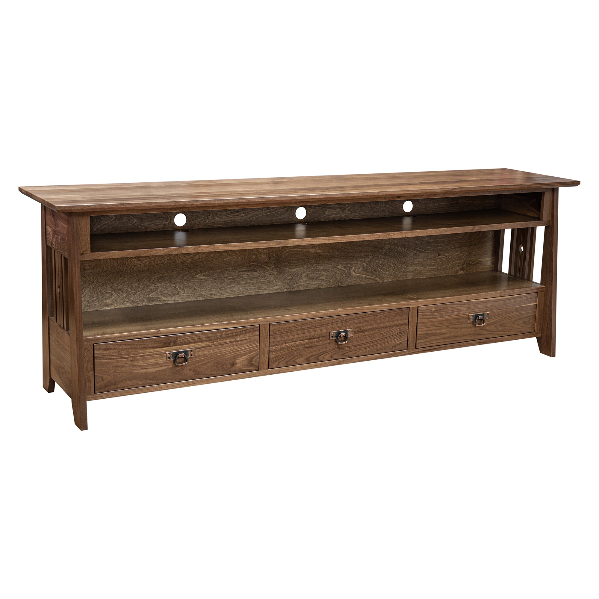 This 90" Amish Mission TV Stand is constructed skillfully in the United States by highly experienced Amish Craftsmen using Solid Oak. This TV Stand offers plenty of storage space. In addition, this piece features three spacious drawers that are well designed for organization.