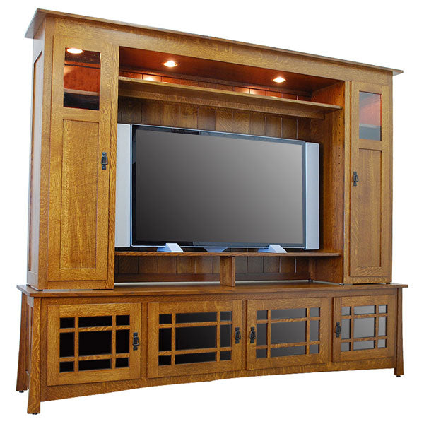This entertainment system is custom built to order with your choice of finish, grain pattern, and choice of hand-poured or typical glass. Other features include two large cabinets with adjustable shelves, 4 bottom cabinets that offer plenty of room, traditional English dovetails for stability, ship lap back for solid protection against the natural property of wood to either contract or expand, hand-poured glass and a discrete touch-controlled lamp lighting apparatus. This furniture is built and made to be an antique piece worthy of being a heirloom for all its exceptional qualities. Provide your home with functionality and elegance with this beautiful furniture that is indicative of the highest standards of quality in furniture craftsmanship."