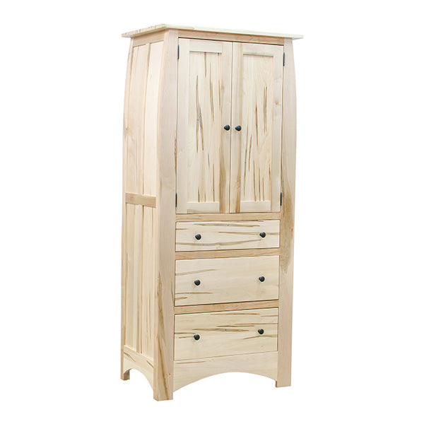 This custom commission is in our Aspen Style reminiscent of the designs of Frank Lloyd Wright and the flavor of a French Vineyard. This Armoire will probably never be in stock; however we would love to build one for you exactly the way you want it. This Armoire here is fabricated from Spalted Maple in a Natural finish. Red Aromatic Cedar drawer bottoms and dovetailed drawers are the secondary woods.
