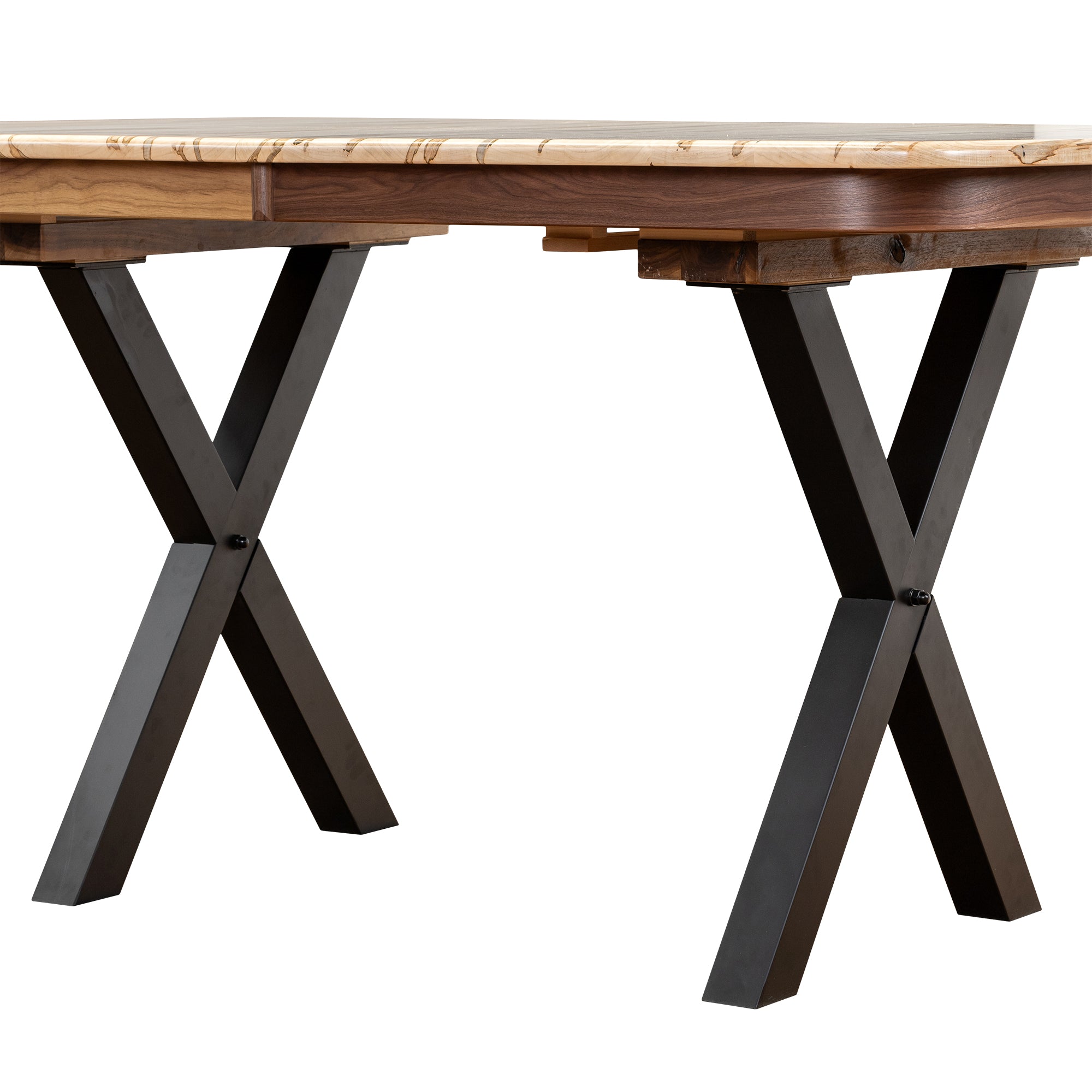 This Amish Galveston Solid Wood Dining Table is a clean original contemporary design which incorporates and influenced by mid century architecture. It is a combination of wormy maple and solid walnut. The solid walnut parts are the legs and the apron of the table.
