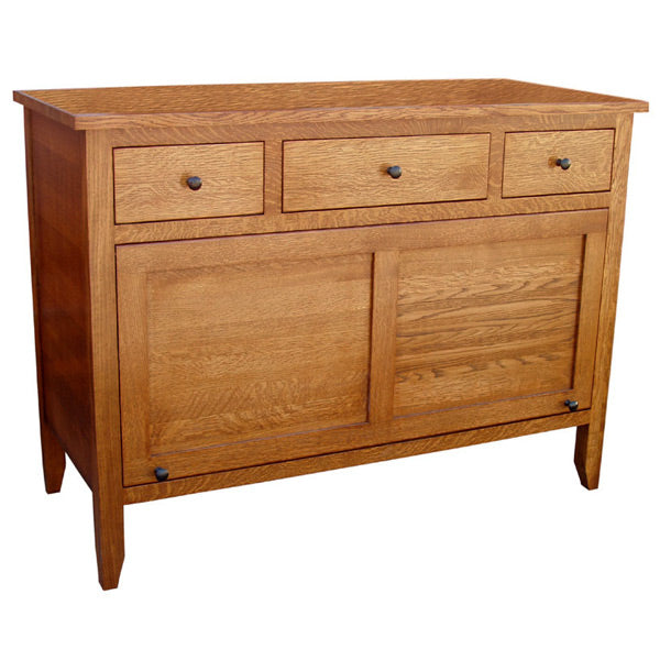 This Amish Mission style Oak Gathering Buffet is constructed in true Amish tradition. It is constructed using dovetail joints, which are both in the front and back of the solid drawer so that that it never loses its shape. In addition, drawer slides are concealed beneath the drawer, so that the dovetail joinery is always in full view. The rollers are self-lubricating to ensure that the drawer will run smoothly time after time. This unit features Smartslides, which are heavy-duty slides that fully extend to view everything in a drawer.