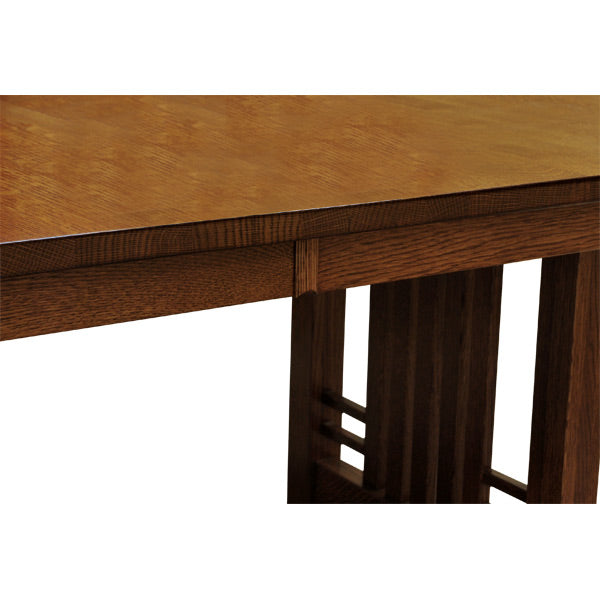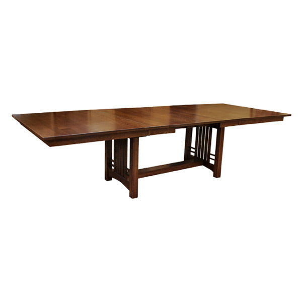 This Amish Mission Bungalow Dining Table with 4-Leaves remains true to the Arts & Crafts style in design and construction. Featuring solid Quarter Sawn White Oak (shown) construction, the unique specks in the grains stand out for an unrivaled look. The functionality of this table will never fail and its overall beauty will mesmerize guests throughout years. The solid Quarter Sawn White Oak used in this table is all hand selected and treated by skilled Amish craftsmen in the Heartland of America. This table expands to 120", which will fit all your guests during special family gatherings. In addition, you can complete your set with the matching Amish Mission Bungalow Chairs.