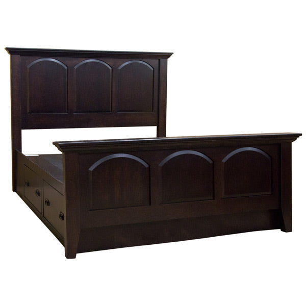 This extraordinarily durable Amish Mission Bed is sealed with a conversion varnish that protects this piece from water, oil, alcohol and even nail polish. Other features this bed features are side drawers that sit on full-extension side mount ball bearings for an exceptionally smooth motion allowing it to easily and gracefully glide open and shut with no exertion necessary. Furthermore, this bed can be custom made in any size, wood and finish.